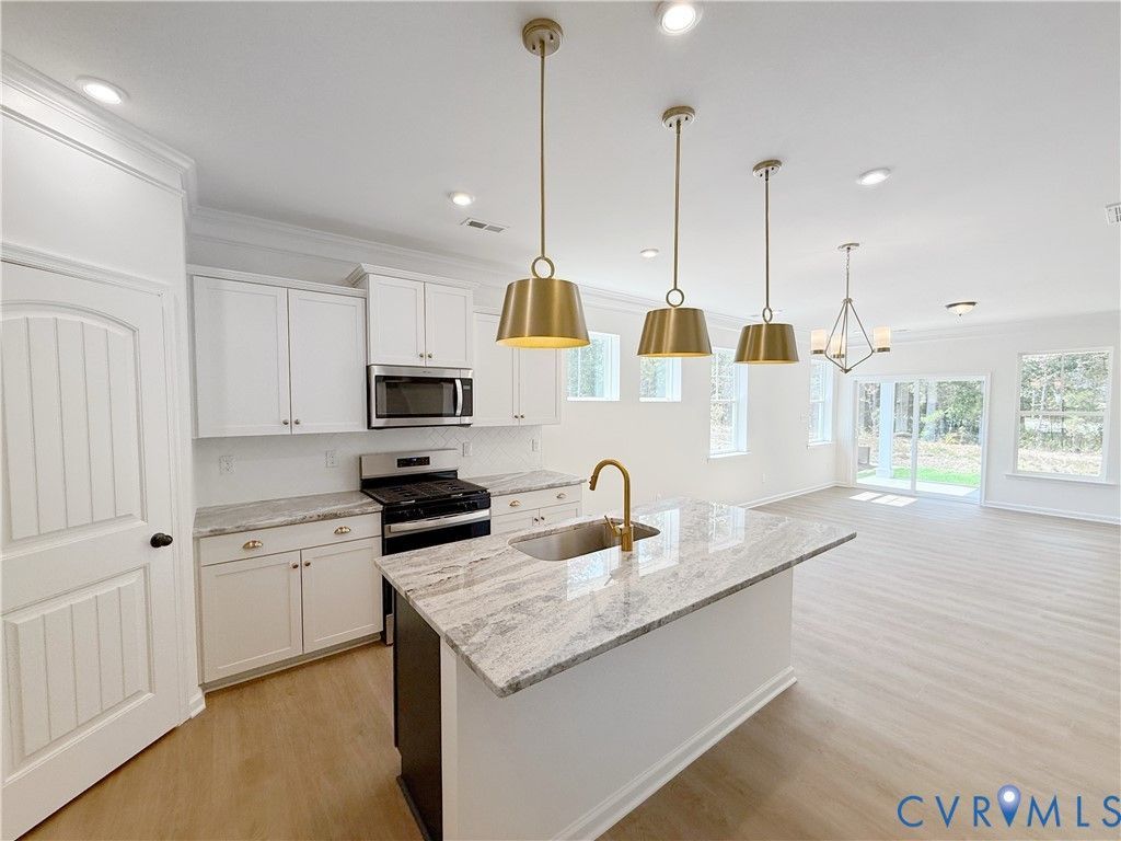 Discover Wyndham Plantation West, a peaceful new townhome at Williamsburg, set within a charming, established community surrounded by mature trees and convenient amenities. The Chamberlayne paired villa home blends comfort and elegance with five bedrooms, two and a half baths, a one-car attached garage, and the convenience of a FIRST-FLOOR PRIMARY bedroom. The welcoming foyer leads to a beautifully designed kitchen featuring a center island, quartz countertops, gas cooking, a walk-in pantry, crown molding, and stainless steel appliances, perfect for everyday living. The dining area flows into the spacious family room highlighted by the Allusion electric fireplace, creating a warm and inviting atmosphere. Tucked privately at the rear, the primary suite offers a huge walk-in closet and a spa-inspired bath with a LUXURY walk-in shower, double vanity, and direct access to the covered rear porch, ideal for relaxing mornings or peaceful evenings. A laundry room, a powder room, and a built-in drop zone add everyday convenience on the first floor. Upstairs, four additional bedrooms with ample closet space, carpet flooring, a full hall bath, and a versatile loft provide plenty of room to live, work, and unwind. Enjoy a well-balanced lifestyle just minutes from Colonial Williamsburg, New Town, William & Mary, and scenic local trails. With breathtaking views and modern amenities with convenient access to shopping, dining, and entertainment, Wyndham Plantation West is where tranquility meets excitement.