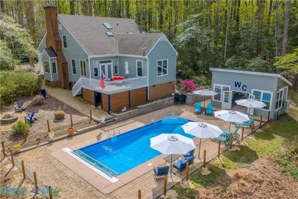 Wilton Creek ? 3.40 acre private waterfront point with over 700 of shoreline..2,900 SF recently renovated home has wide water views from first-floor primary suite with ensuite bath and washer /dryer..All-new kitchen & island bar with the latest appliances, brick backsplash wall, double ovens & gas range.. Second level includes 3 bedrooms, 2 baths, another laundry room and office.. Living room with brick fireplace & gas logs.. Recent oak hardwood flooring throughout.. ¦¦¦ Sunporch overlooks fenced in salt -water pool & pool house has mini split heat pump, wet bar, fridge and cable-ready!.. Great for outdoor entertaining with firepit and easy walk to dock and boatlift for a day out on the water! Good water depth at the dock approx. 4 to 4 1/2 ft. MLW. also, two-car detached garage & upstairs area with potential ..at present, utilized as an exercise room¦